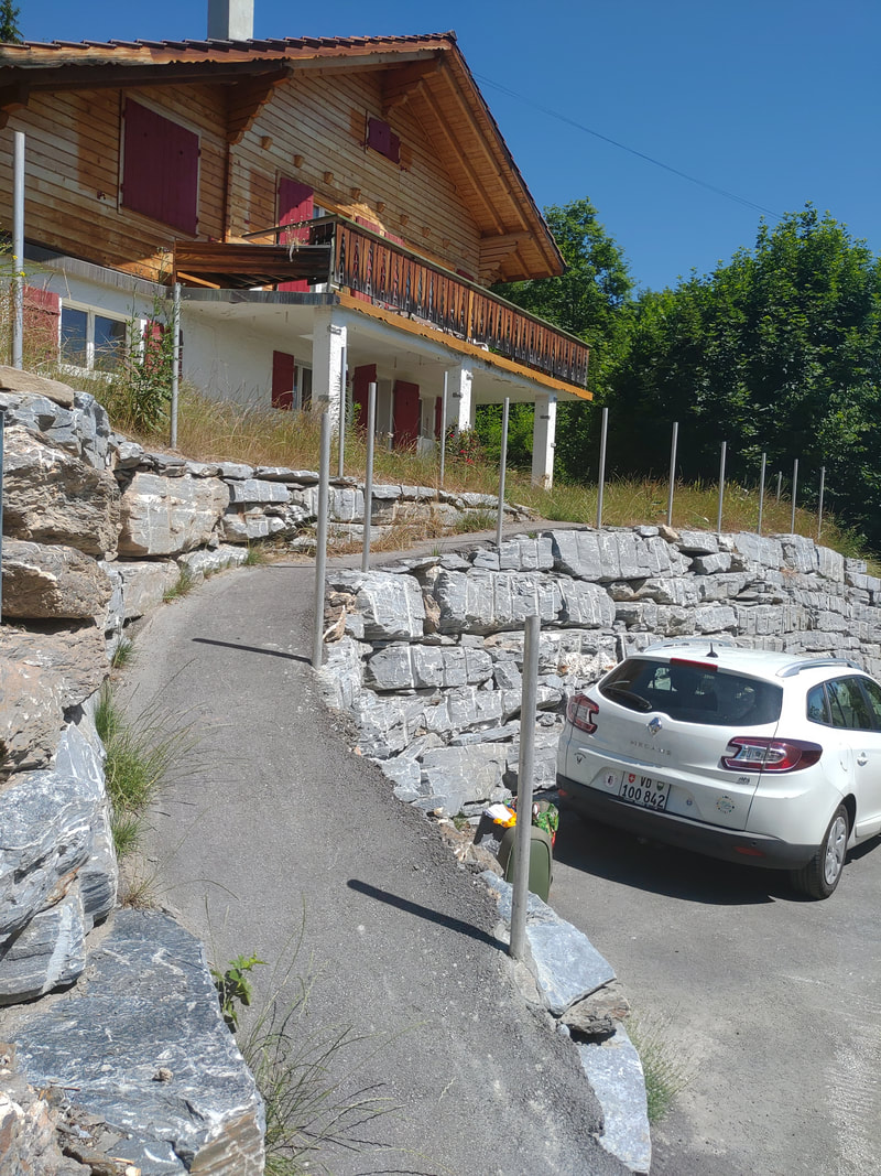 Un petit chemin goudronné vous mène devant votre terrasse. Vous la contournez pour aller vers le côté est, sous l’escalier extérieur. Votre porte d’entrée se trouve juste là.