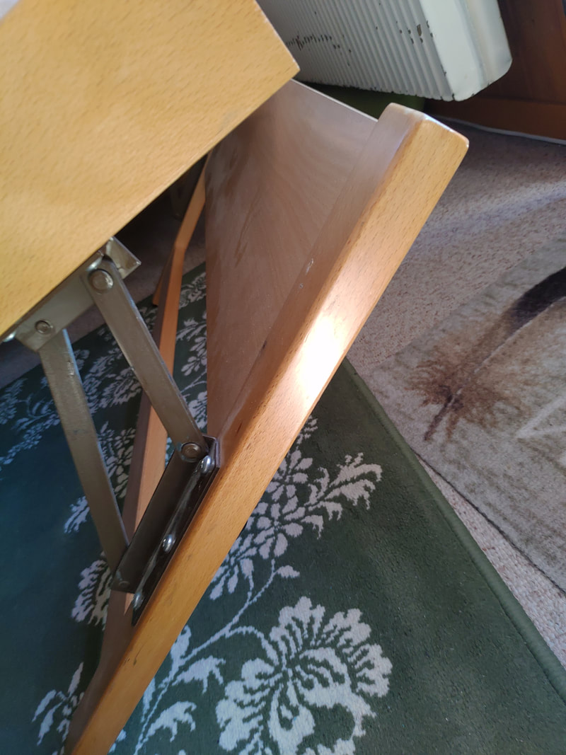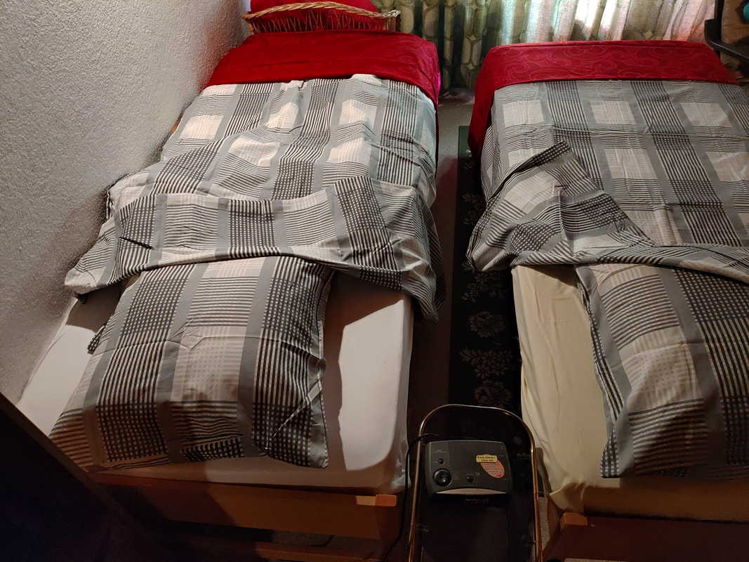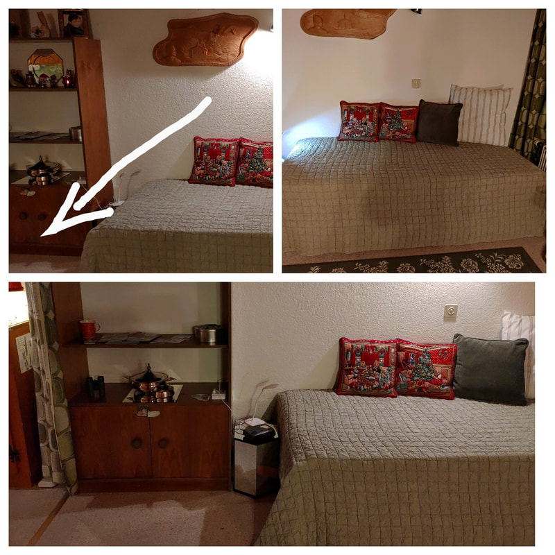 Il vous suffit de retirer le couvre-lit vert, puis, si vous avez loué pour 2 personnes, de tirer le lit inférieur vers le centre de la pièce. En soulevant ensuite le bas et le haut du cadre du sommier – à deux c’est très facile – les pieds se déplient facilement, mettant les deux lits à la même hauteur.