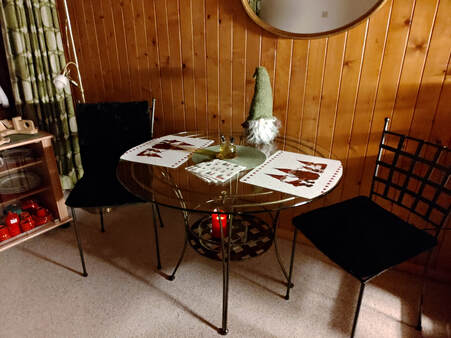 L’hiver, une nappe résistante est déjà en place et le banc est déjà « habillé » avec de la peau de mouton pour les fesses et des plumes de canard pour le dos 😉