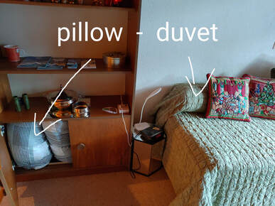 Merci de laisser les duvets et oreillers déshabillés sur le lit du dessus, pas besoin de remettre le couvre-lit, je m’occupe du reste.