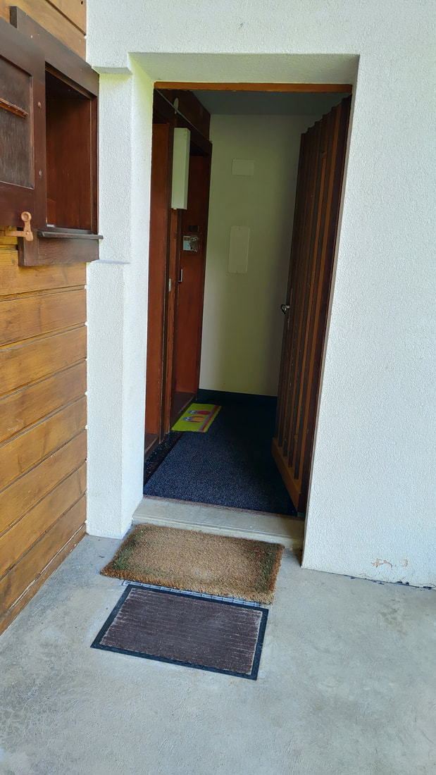 Une fois devant la porte du studio « Repaire des Hiboux » avec le paillasson vert, la boîte à clef est fixée sur le cadre de la porte à gauche.